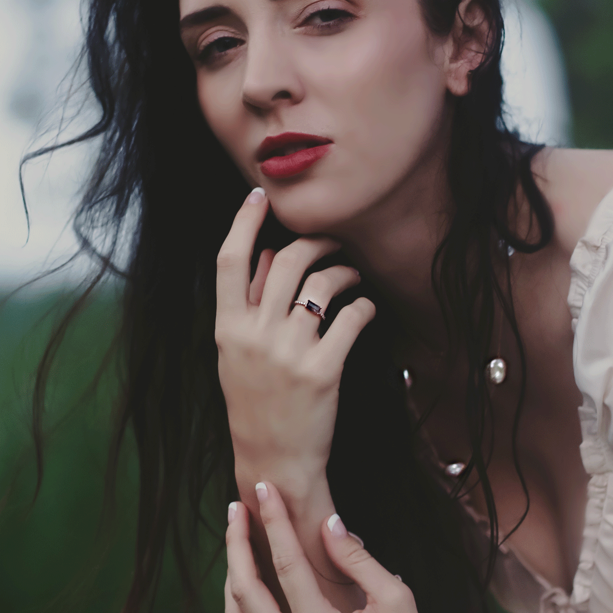 Center 8x4mm baguette cut natural super seven cacoxenite amethyst gemstone is 1.06ctw. It features black and copper colored acicular (needle-like) inclusions. The cacoxenite amethyst contains seven crystals in one. The crystals are: Amethyst, Cacoxenite, Goethite, Lepidocrocite, Rutile, Smoky Quartz, and Quartz. The purplish color of this unique gemstone is complimented by the 10K rose gold setting designed, cast, and set by hand by Jillery. The center stone is flanked by 10 SI quality natural diamonds. This ring is one of a kind. Ring size 5.75